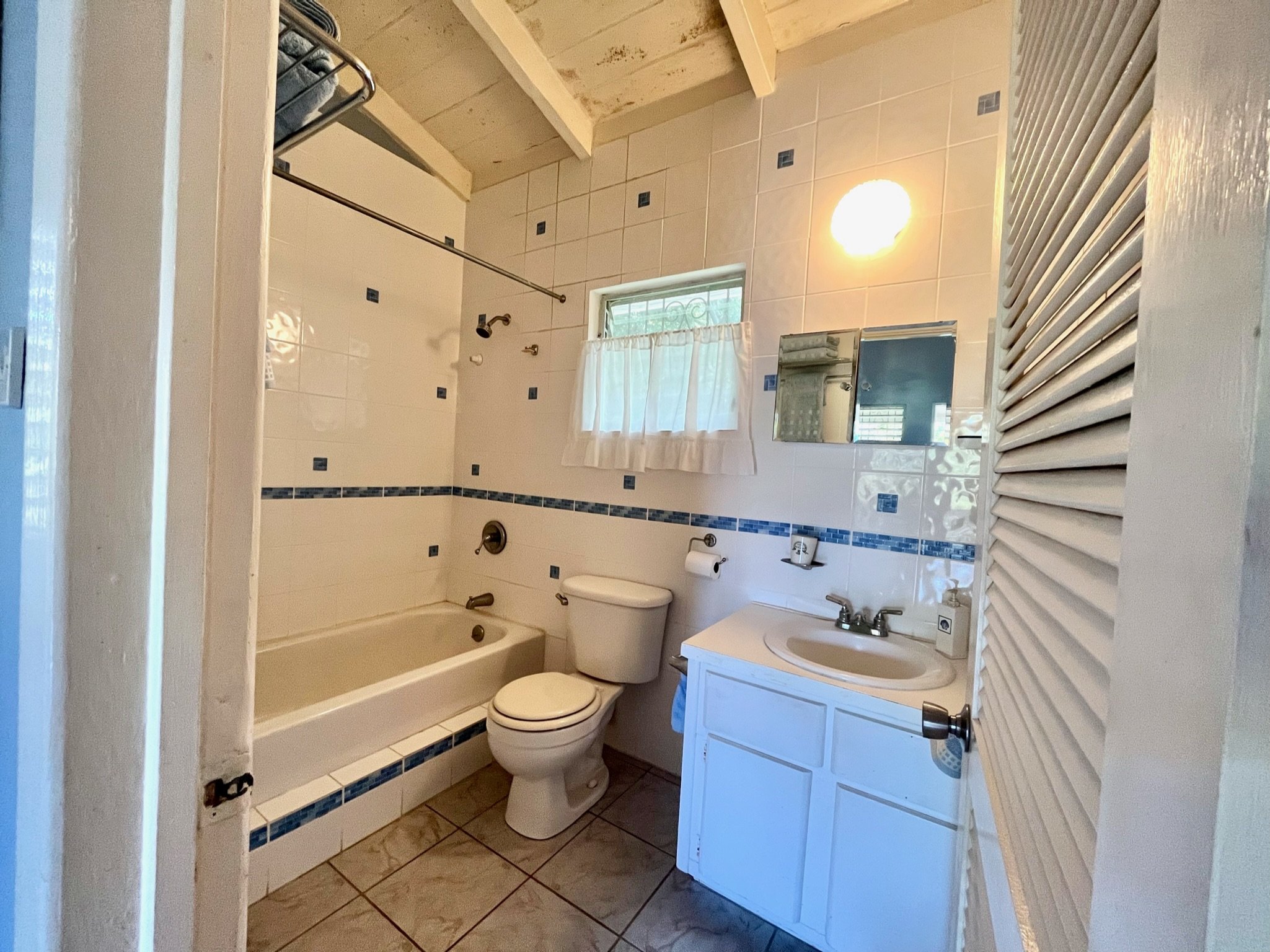 Enter the home via secondary steps to the long covered balcony, a perfect spot for your morning coffee, afternoon lunches, or a sundowner cocktail, and into a combination living/ dining room. Stylish tiles accent the floor, and the dining area features a built-in bar or hutch alcove concealed by louvered doors. White walls reflect the light, but deep eaves help keep the room cool. Facing the Sea, a set of sliding doors and window let nature in. The added back porch can be accessed from the kitchen, main room, plus an outside walkway. This restful easterly facing deck overlooks greenery of the property….so peaceful!
