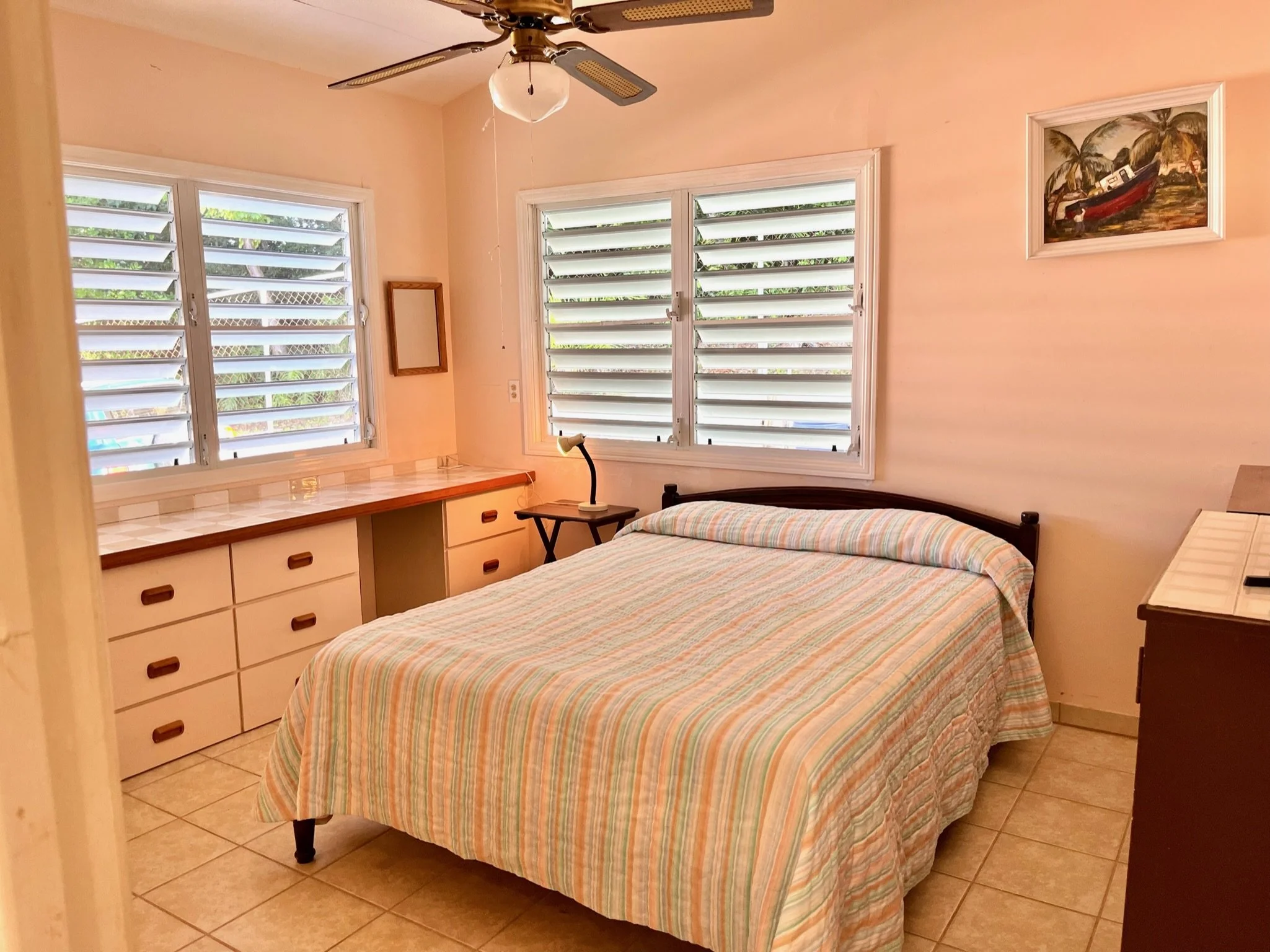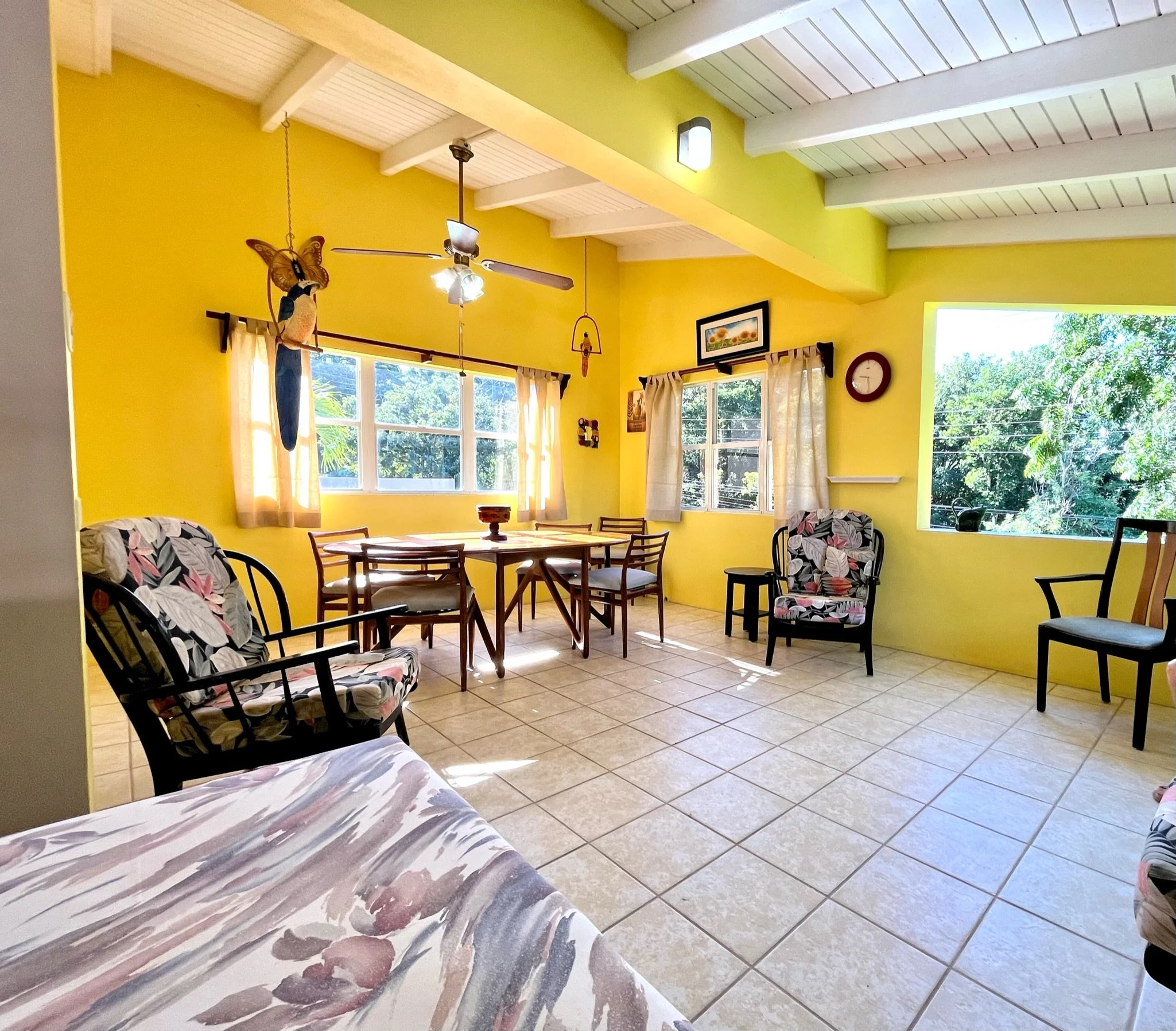 From the kitchen one can either go straight through to a fully covered back porch fitted with comfy furniture for afternoon “liming”, or jog left into a large (13’X18’) flexible space known as the “sunroom”. Whether you choose to make this smart addition a dining room, accessory sleeping for overflow guests, artists studio or craft room is up to your imagination.