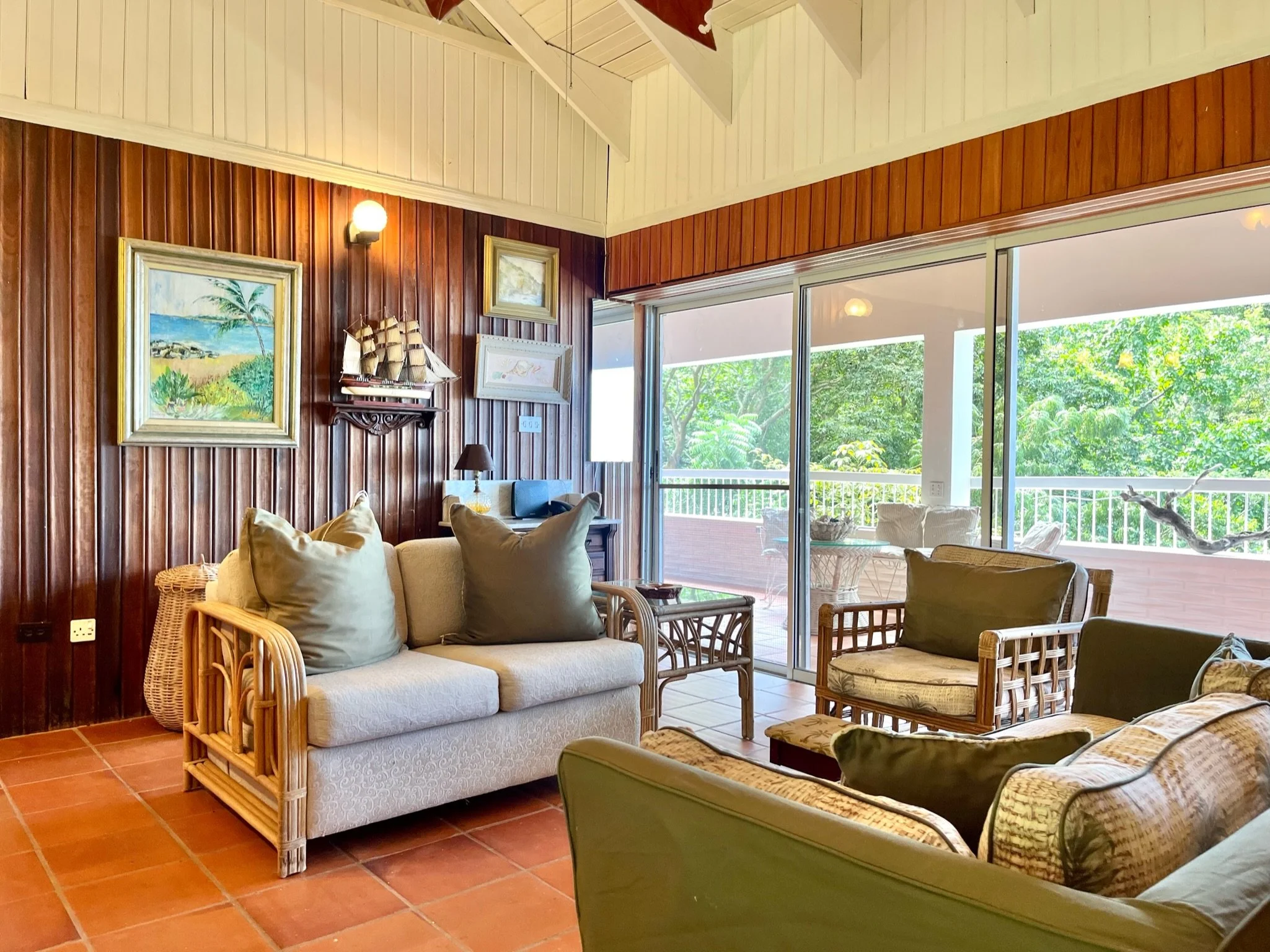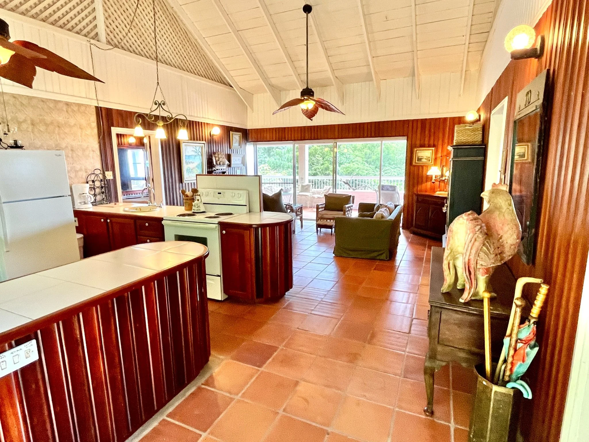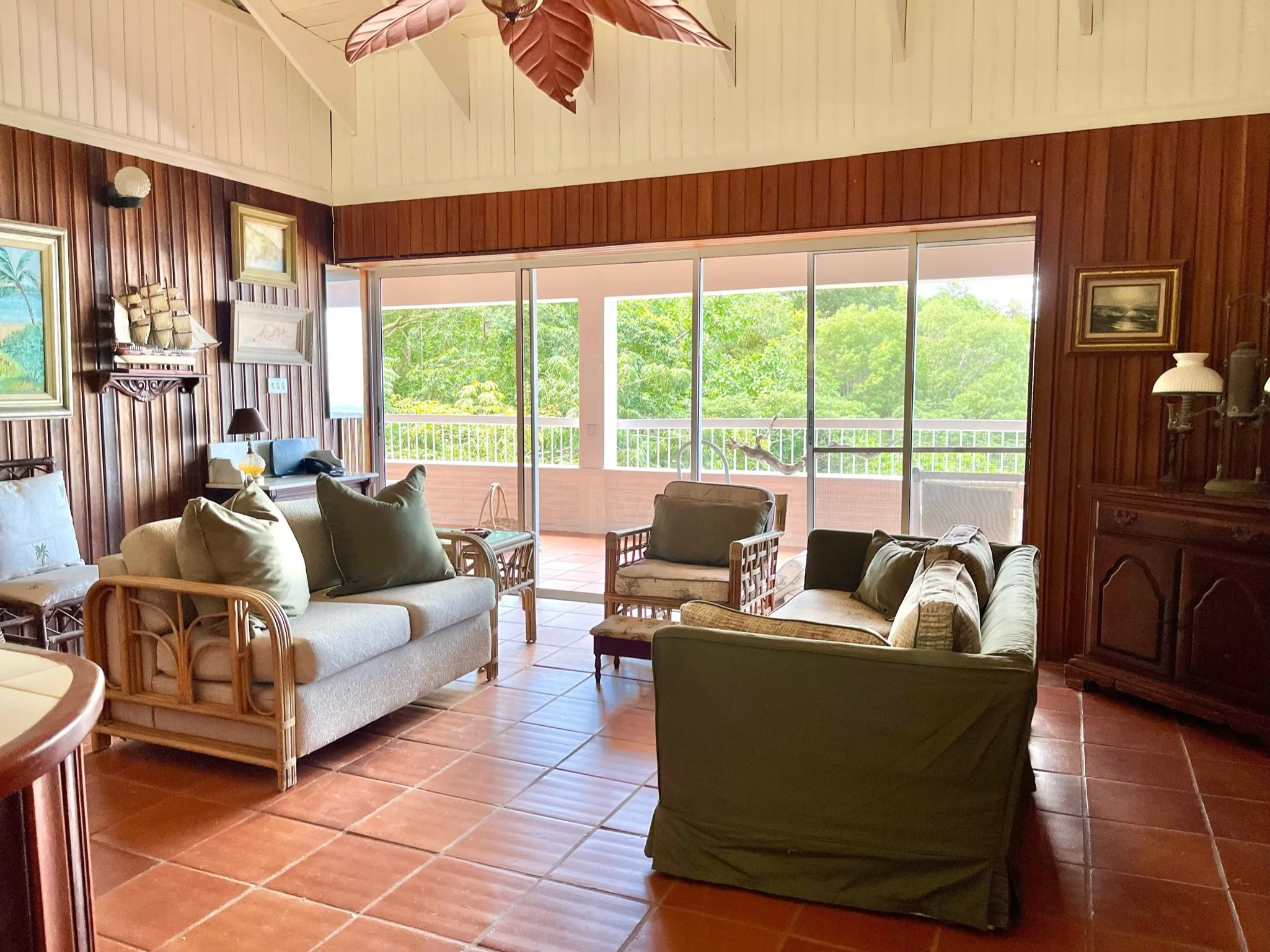 At first glance the unassuming facade of this home fails to hint at the great space that will undoubtedly surprise you once inside. Enter into an open plan great room with soaring ceilings. The warmth of tropical hardwoods engulfs you immediately….from the mahogany locally constructed kitchen cupboards to the walls clad in exotic greenheart paneling. Plenty of storage in the kitchen with 2 sinks and a spacious pantry closet . Subdued light from the retractable sliding patio doors beckons you out to the wrap-around gallery: a lounging, dining and entertainment area where you’ll probably spend the bulk of your time.