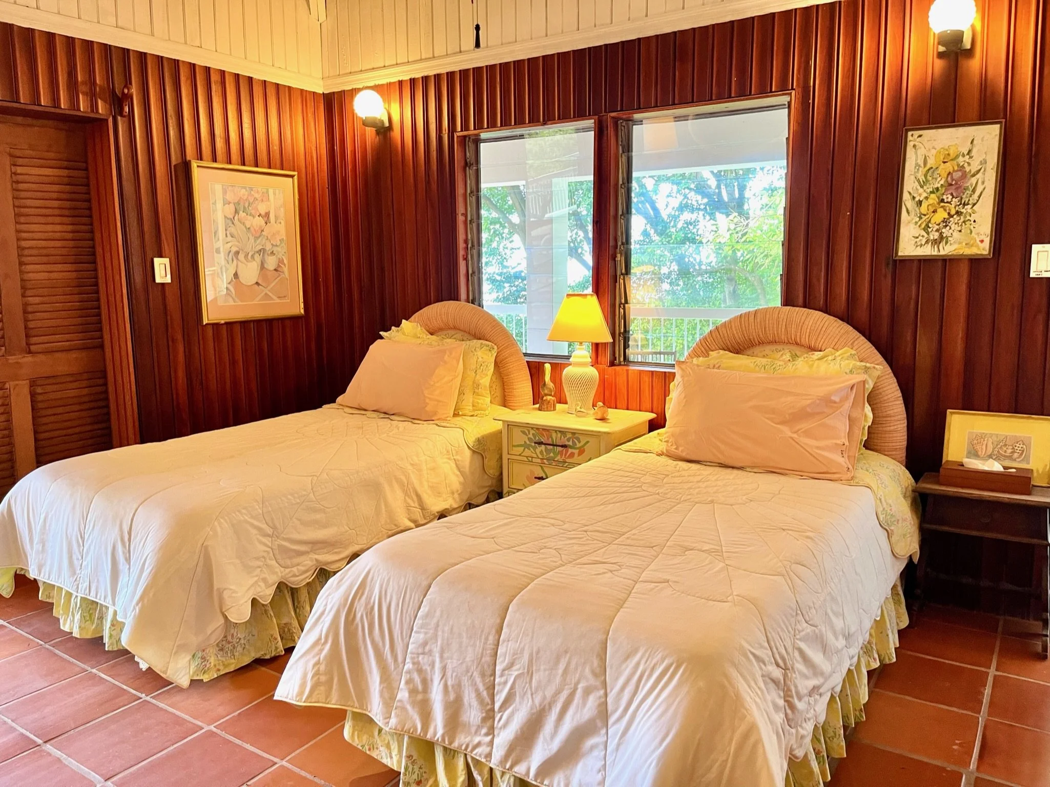 2 large bedrooms, one situated at each end of the great room share the same warm paneling and stained wood louvered sliding panel doors. The primary suite has a spacious closet, full bath with separate shower and jacuzzi soaking tub. The other bedroom has a large closet, built in drawers and an ensuite full bath as well. Both bedrooms spill out to the gallery.